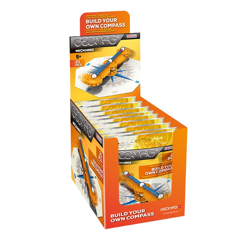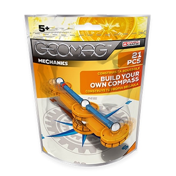 Se stavebnicí Geomag Mechanics Compass 21 dílků poznáte účinky magnetického pole Země a hravou formou se naučíte určovat světové strany. Tato magnetická stavebnice je proto vhodná i jako školní pomůcka.